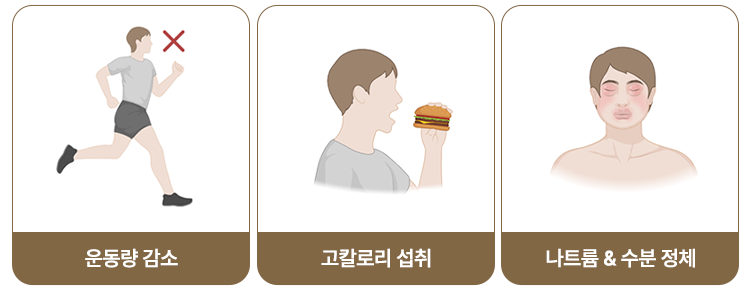 게다가 운동량은 줄고, 나트륨 섭취는 늘어나 수분·체지방이 함께 쌓이는 급찐살 현상이 일어나죠.